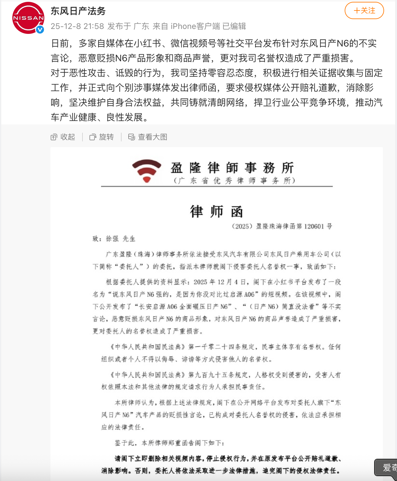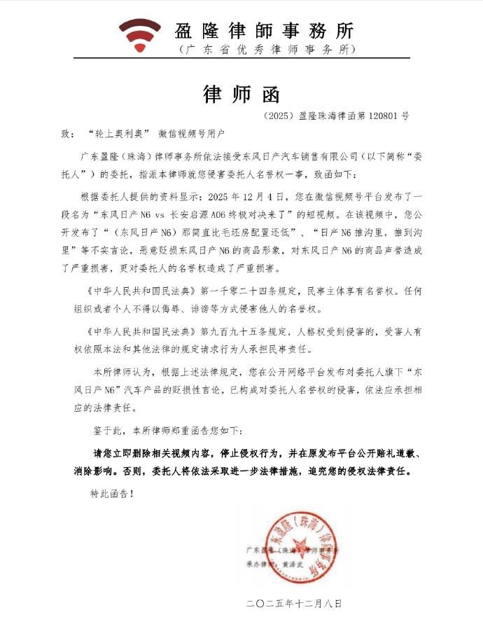 12月8日,东风日产法务部贴出了两份讼师函,其中就全齐直白地“复制”了有关自媒体的视频和图文标题,也便是“说东风日产N6强的,是因为你莫得对比过启源A06”,况兼在视频中出现了“长安启源A06全面碾压日产N6”、“(日产N6)险些没法看”等言论,而在另一个名为“东风日产N6 VS长安启源A06终极对决来了”的视频中,则出现了“(东风日产N6)那险些比毛坯房确立还低”、“N6推沟里,推到沟里”等言论。在东风日产法务部贴出的这两份讼师函中,推行上来说,便是直指长安启源A06!